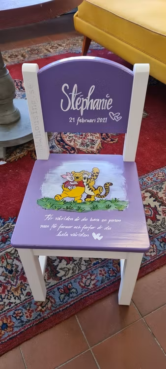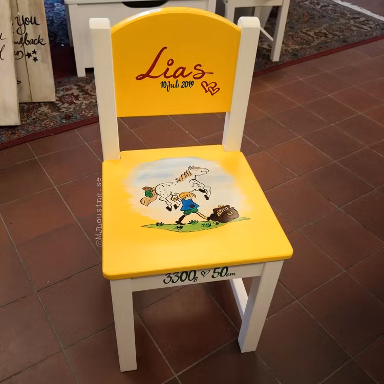 Du bestämmer vilken text vi ska skriva, samt ett motiv du önskar på just din stol. Vanligast är att vi skriver namn och ev. datum på ryggen och målar motiv på sitsen. Det ingår ett motiv samt namn och om du önskar längd, vikt och klockslag i priset. Produktbilderna visar bara vad vi fått äran att tillverka innan. Önskar du ett speciellt motiv laddar du upp en bild på önskat motiv ovan.