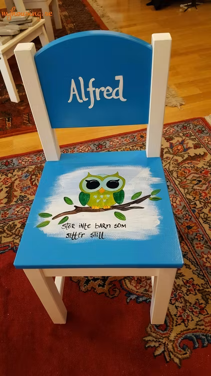 Varje stol görs för hand och skiftningar på färg och textning gör varje stol unik. Innan din stol skickas till dig kommer ett förslag via mail eller mms för dig att godkänna. Allt för att du ska bli riktigt nöjd med din stol...