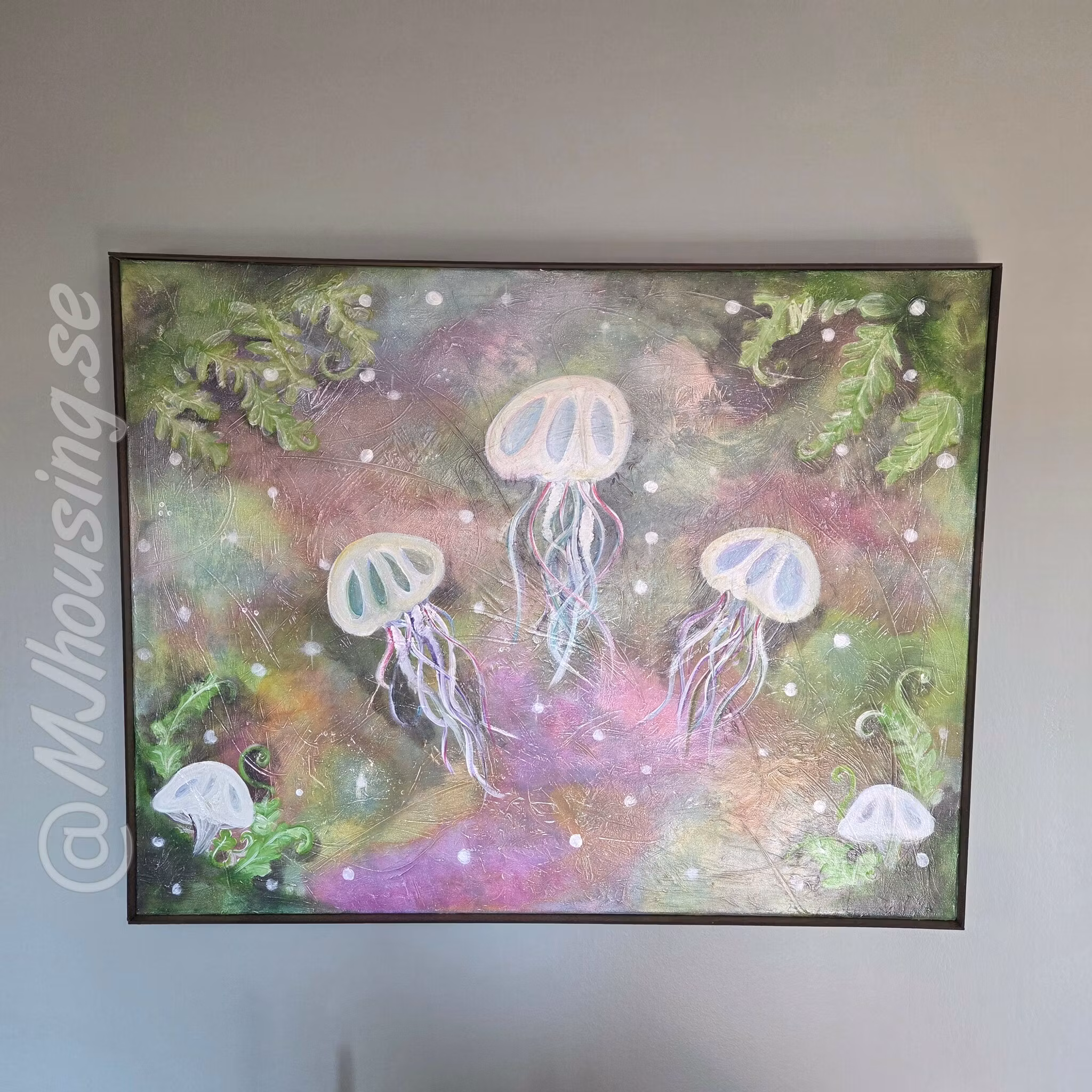 I detta verk möts havets skirhet och en frodig grönska i en harmonisk symbios. Fem vackra maneter, med sina delikata trådar, svävar genom ett hav av djuplila, magentafärgade och jordnära toner. De ormbunke-liknande gröna bladen som omsluter kompositionen skapar en koppling mellan havets djup och landbackens lugn. Bakgrunden, fylld av textur och små vita ljuspunkter, liknar ett gnistrande undervattensplanktonfält eller en stjärnbeströdd rymd, vilket ger en känsla av rymd och magi. Detta är ett landskap som bjuder in till eftertanke.
